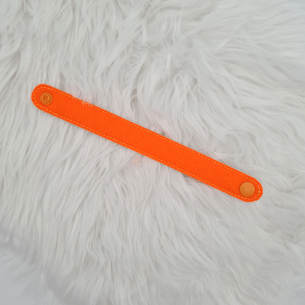 Dieses einzigartige Armband besteht aus silberfarbenem Hologramm-Kunstleder und verfügt über eine lebendige orange Stickerei, die perfekt zur Rückseite und dem Kunststoffdruckknopf passt.
