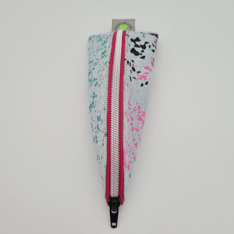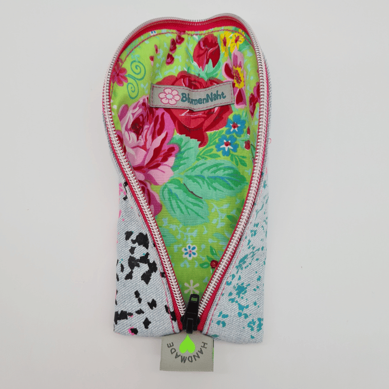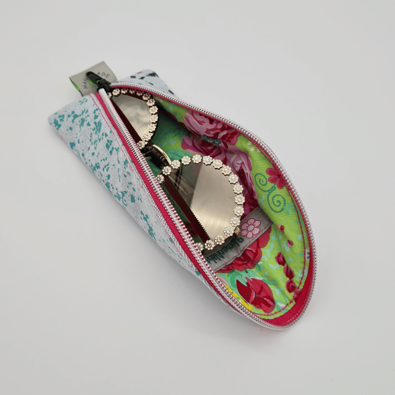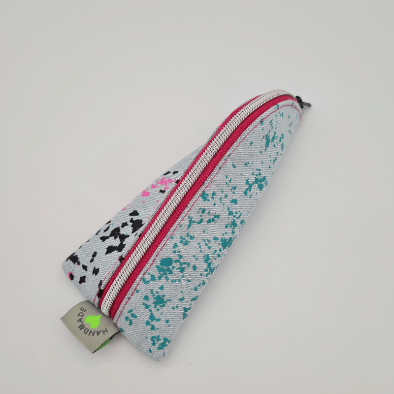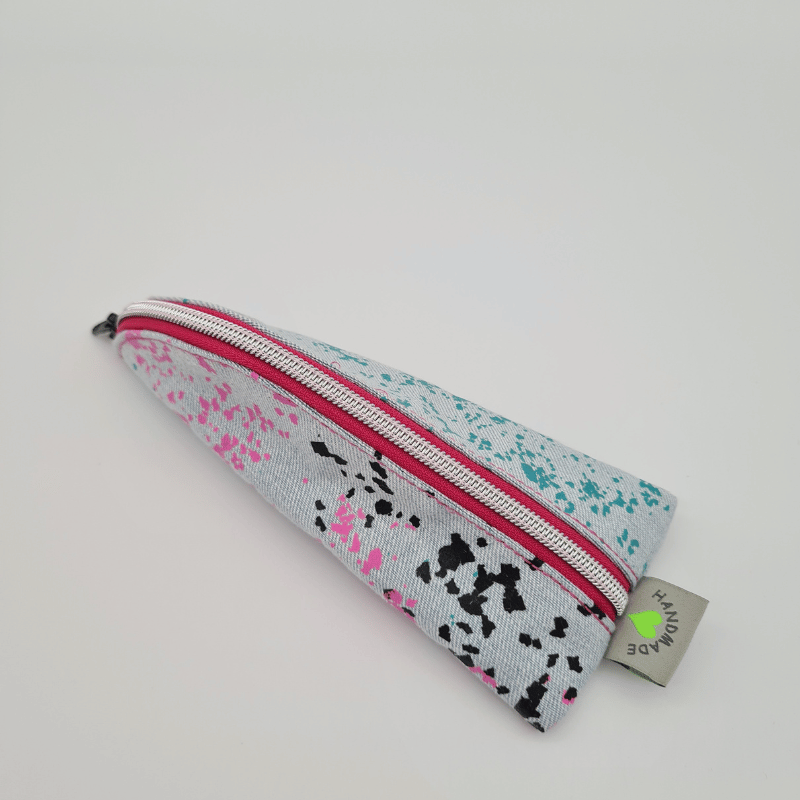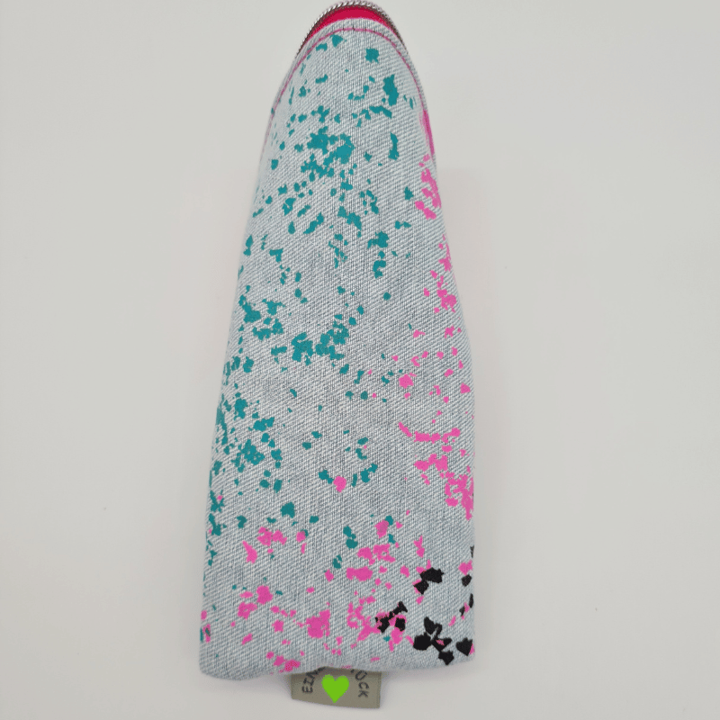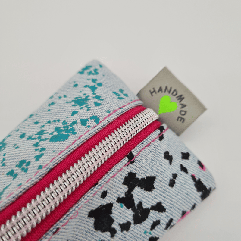 Dieses Brillenetui besteht aus robustem Jeansstoff, verziert mit Konfetti Sprenkel in schwarz, pink & petrol.