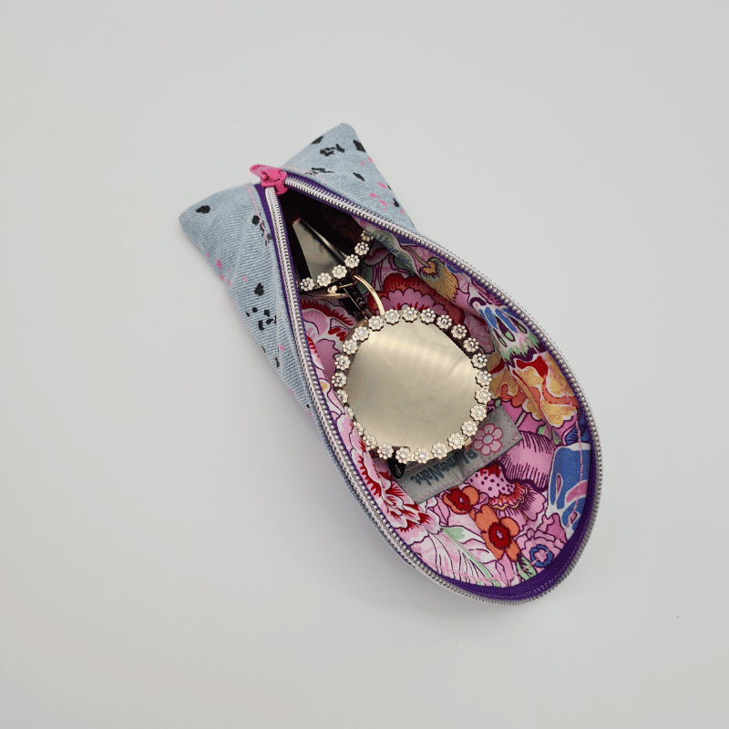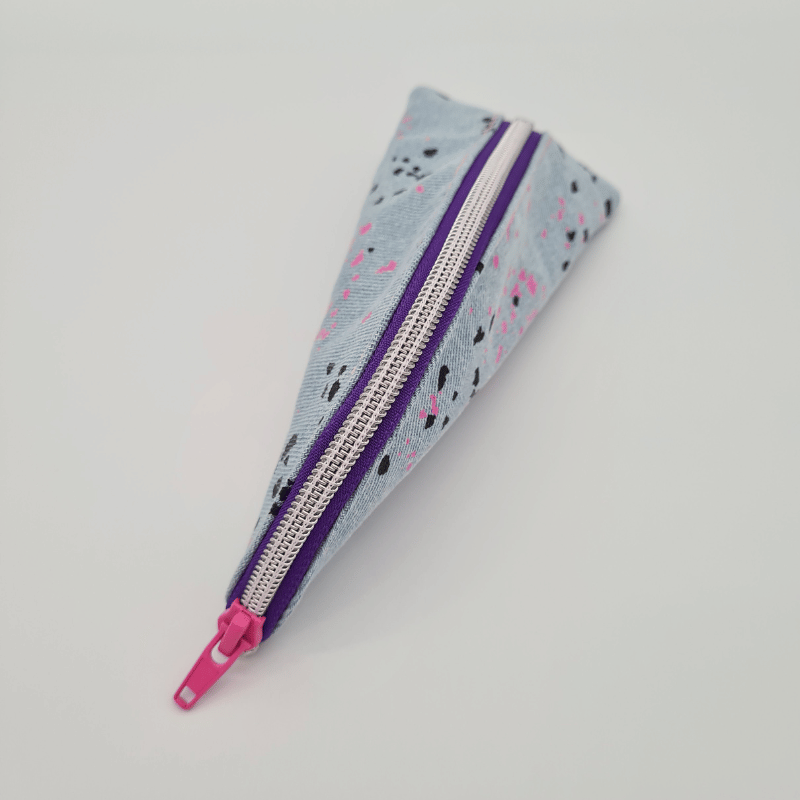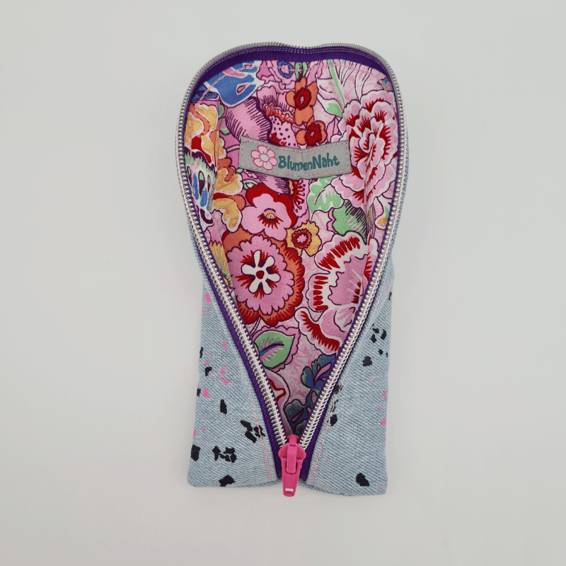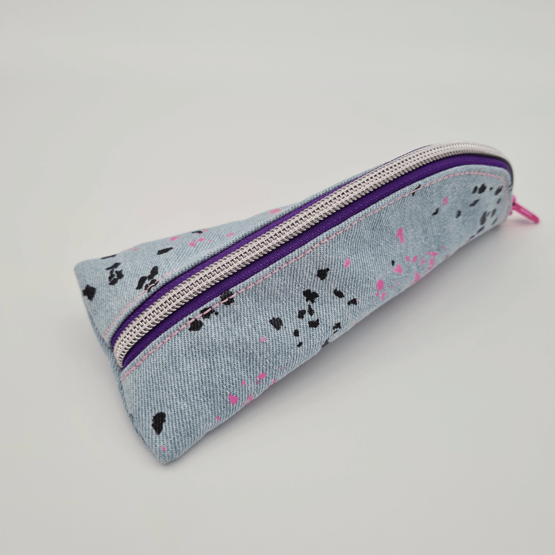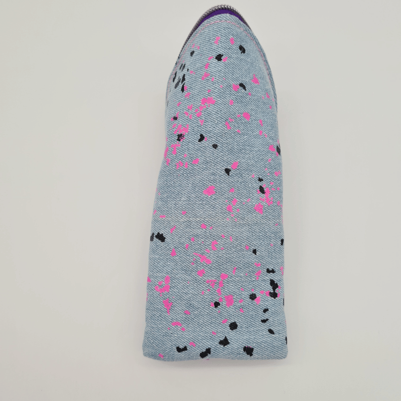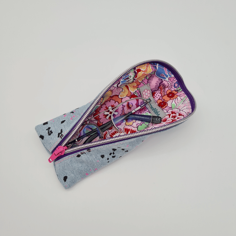 Dieses Brillenetui besteht aus robustem Jeansstoff, verziert mit Konfetti Sprenkel in schwarz und pink.