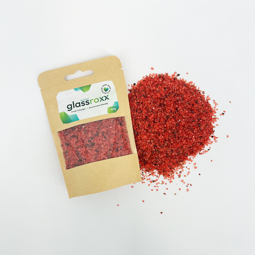 GlassRoxx ist ein Glasgranulat, das vollständig aus recyceltem Glas hergestellt wird und mit organischen, langlebigen Pigmenten auf Wasserbasis bemalt ist.