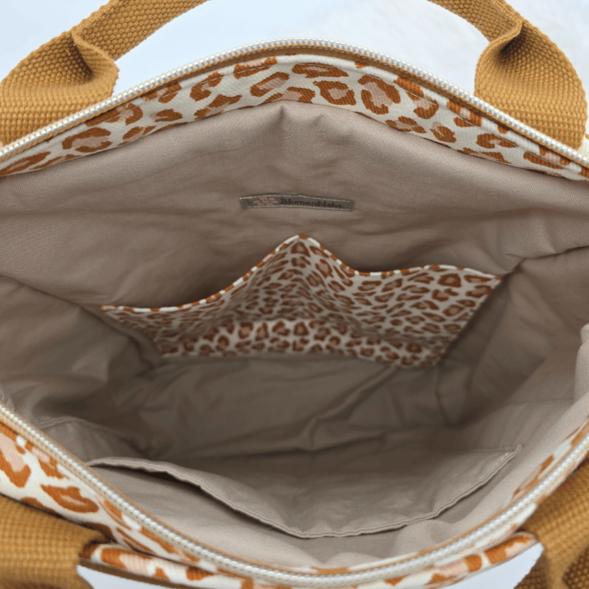 Das hochwertige, offwhitefarbene Material erinnert an robusten Jeansstoff – weich im Griff, aber dennoch formstabil. Das feine Leo-Muster in Beige/Braun verleiht der Tasche eine moderne, schicke und zugleich sportliche Ausstrahlung, die sich mühelos mit nahezu jedem Outfit kombinieren lässt.