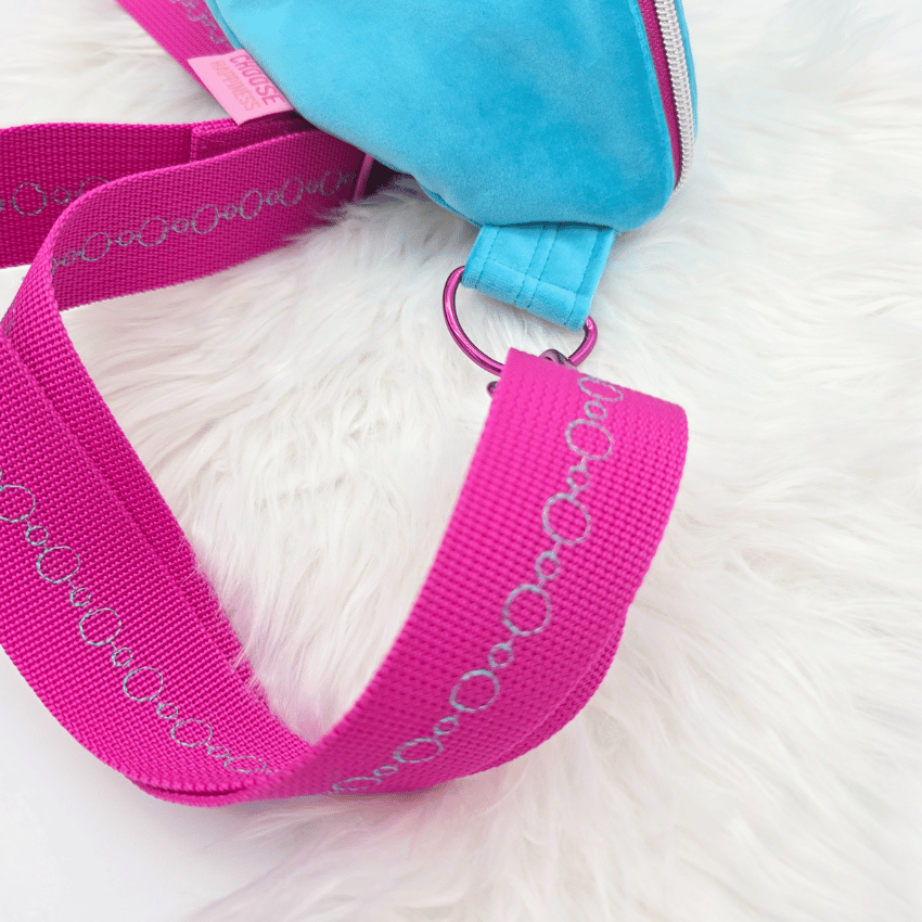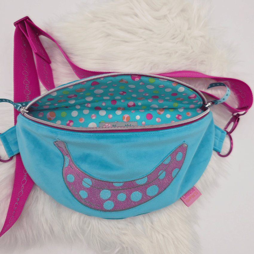 Diese Gürteltasche überzeugt mit ihrem weichen, samtigen Griff, der durch den hochwertigen Polsterstoff entsteht, und bietet ausreichend Platz für Handy, Kosmetik, Schlüssel und Geldbörse. Der 4 cm breite Gurt ist in passender Farbe bestickt und lässt sich nicht nur in der Länge verstellen, sondern auch abnehmen – so kannst du jederzeit einen anderen Gurt wählen und deiner Crossbag im Handumdrehen ein neues Design verleihen. Der Außenstoff ist in einem frischen Türkis-Blau gehalten, und passend dazu habe ich eine Banane gestickt und ein wenig Glitzer eingearbeitet, was der Tasche das gewisse Extra verleiht.