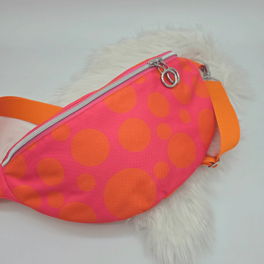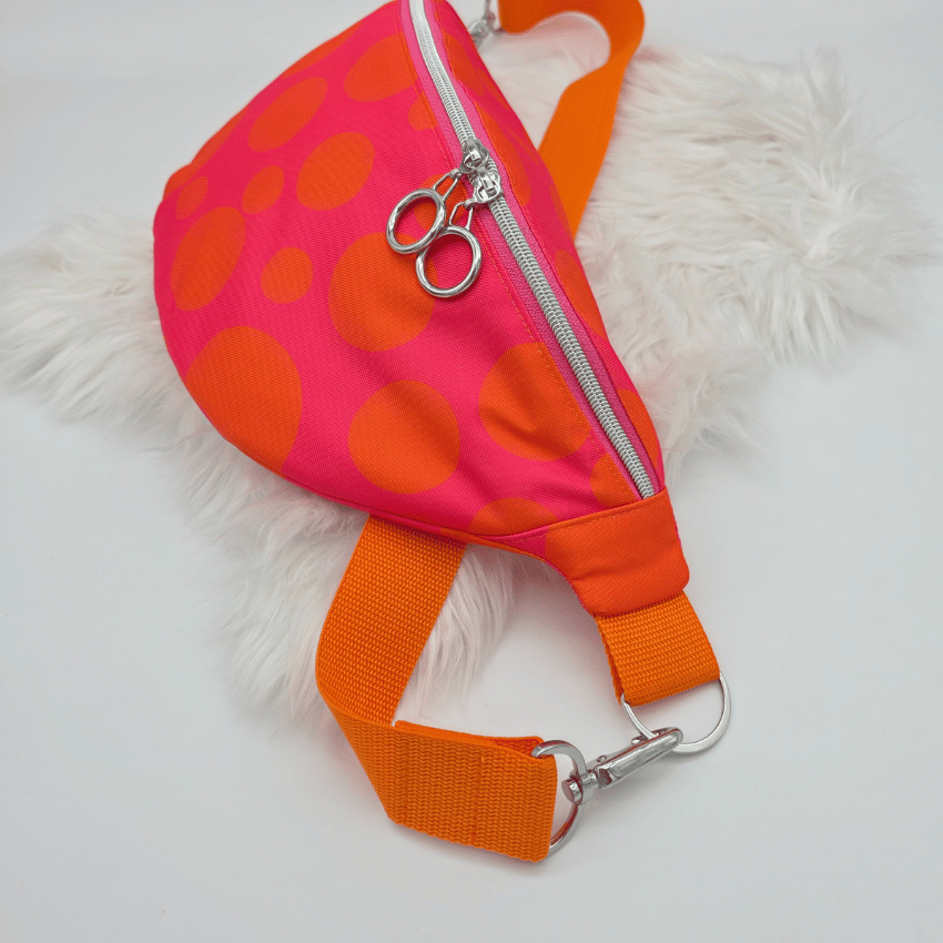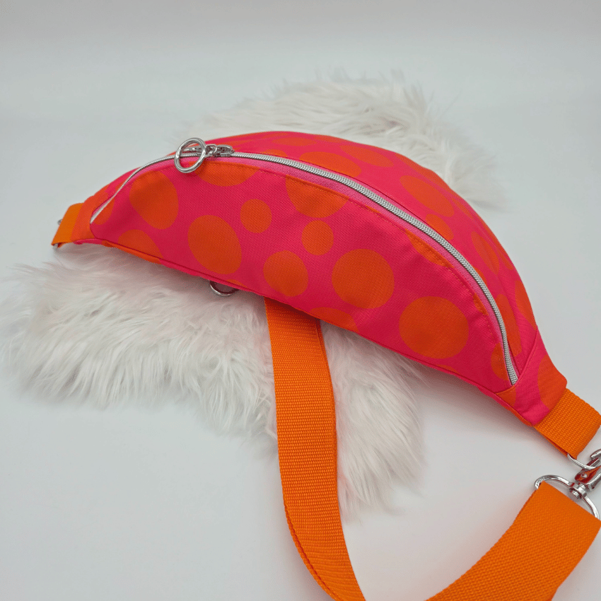 Diese Crossbody Tasche in Pink und Orange setzt mit ihrem knalligen Farbkontrast ein echtes Statement. Perfekt als Sommertasche oder um grauen Wintertagen Farbe zu verleihen.