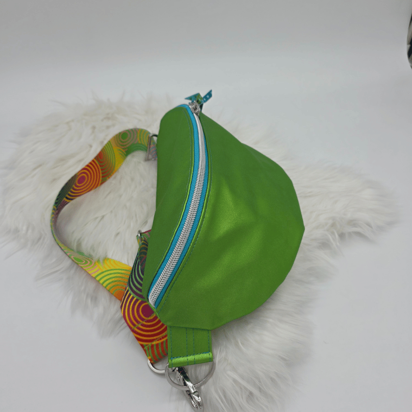 Diese Gürteltasche aus grünem Glitzerkunstleder hat einen etwas festeren Griff und bietet ausreichend Platz für Handy, Kosmetik, Schlüssel und Geldbörse. Das 4 cm breite Gurtband lässt sich in der Länge verstellen und ist sogar abnehmbar, sodass du es ganz nach Belieben gegen einen anderen Gurt austauschen kannst – so erhält deine Crossbag im Handumdrehen ein neues Design.