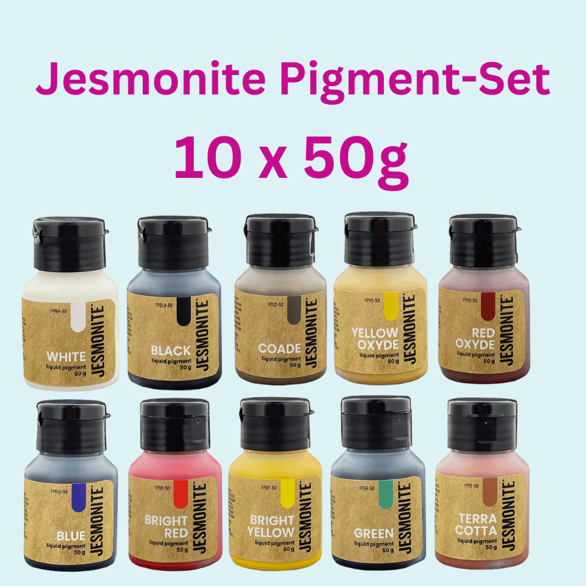 50g reichen für ca. 2,5kg Jesmonite, je nach dem wie Farbintensiv du es haben möchtest.