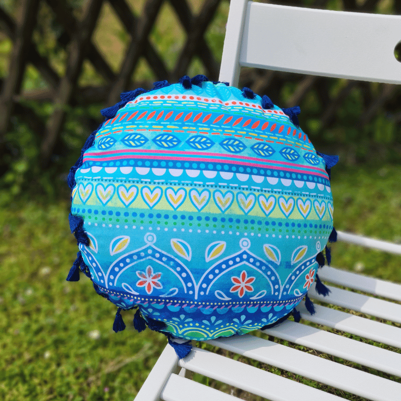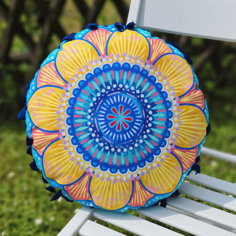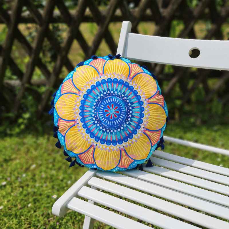 Das runde Mandala Kissen hat einen Durchmesser von ca. 31cm und eine Dicke von ca. 11cm.